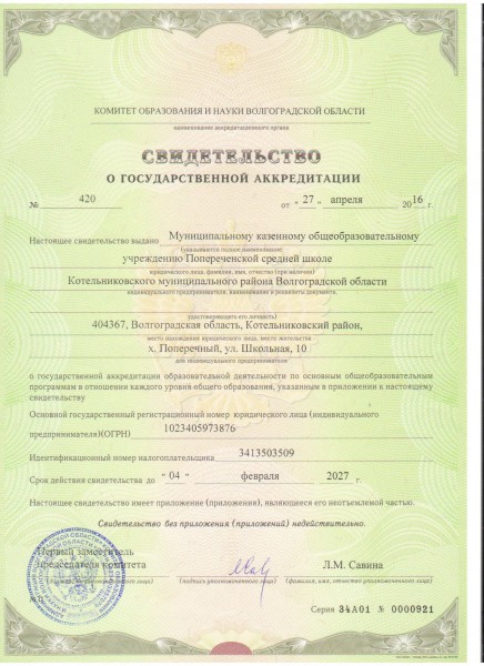| Адрес местонахождения образовательной организации* | 404367, Волгоградская обл., Котельниковский р-н, х. Поперечный, ул. Школьная, 10 |